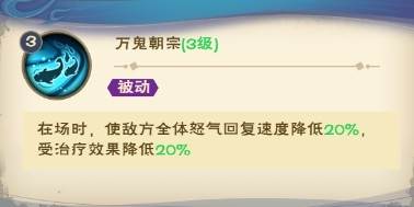 在场时,使敌方全体怒气回复速度降低20%,受治疗效果降低20%。