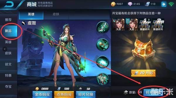 王者荣耀主界面→ (右侧)商城→ (左侧)新品→ (右下角)碎片商店