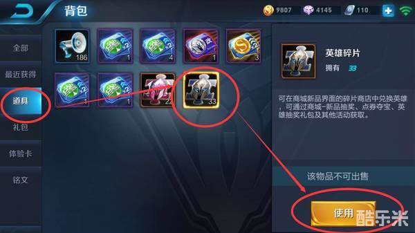 王者荣耀主界面→ (右下角)背包→ (左侧)道具→ (中间)英雄碎片→ (右下角)使用