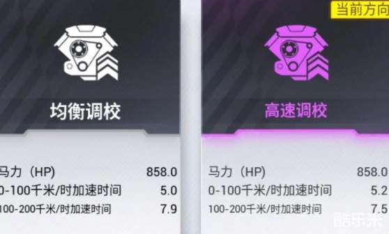 引擎的调整分这里笼统的分为三类,均衡、高速、冲刺。均衡属于通用路况,高速调教在后段的加速效果更好,适合长直线多的赛道;冲刺调教则是在前段的加速效果更好,适合短途冲刺。