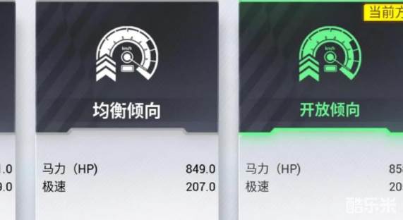 保守、均衡、开放三种倾向,保守用来跑直线,均衡适合复杂的路况,开放则适合弯道多的地图。