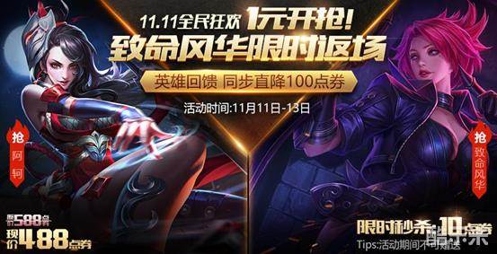 11.11全民狂欢,你不是一个人在战斗!阿轲-致命风华返场回馈,1元开抢!好友、战队开黑总动员,单身贵族头像框、英雄/皮肤碎片、大量铭文碎片等你来拿!