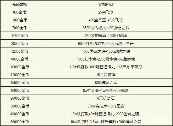 【活动内容】活动期间,游戏内累计充值达到对应金币,即可获得对应奖励;所有商品绝对超值,不信你自己看。相中哪个千万别手软!因为一犹豫也许就不知道何时能再见了。