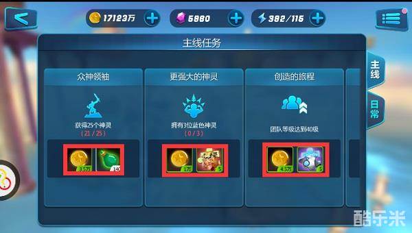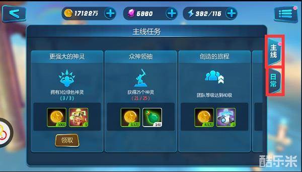主线任务可获取大量的金币以及升级材料(神灵经验)(魔法符石)等,用于神灵升级升星丶魔法升级激活等,达到目标即可领取,但只能领取一次。