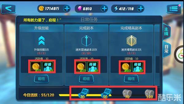 日常任务每日完成一次,完成可获取大量的主角经验和金币,想要升级快就要完成每天的日常任务,完成一个可以增加一部分活跃度,活跃度到达了可以领取对应宝箱,总共四个宝箱。
