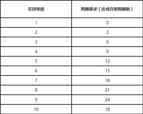 军团长、团长伴侣和副团长可以开启某个幻兽图腾。军团成员可以将同类型的幻兽在该图腾上进行登记, 每天1次。军团的等级规模,由军团超过百星的幻兽图腾数量决定,即图腾总评分超过10000分(100星)。不同等级的军团对超过百星的幻兽图腾数量要求不同;军团的等级,可增加军团人数上限以及同盟/敌对军团数量