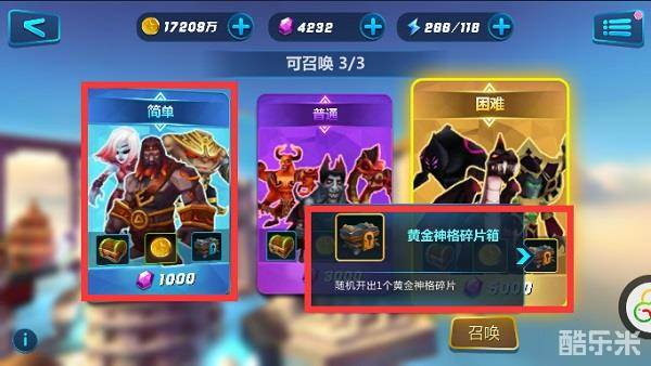 上古魔神玩法分三个难度简单丶普通丶困难,每个难度召唤所需的钻石不同(越高越贵),难度越高获取的神格碎片和宝石品质就越高。召唤后会进入十分钟的准备时间,让其他玩家都可以及时的赶过来帮忙攻打,期间可以进去调整自己的阵容准备迎战。