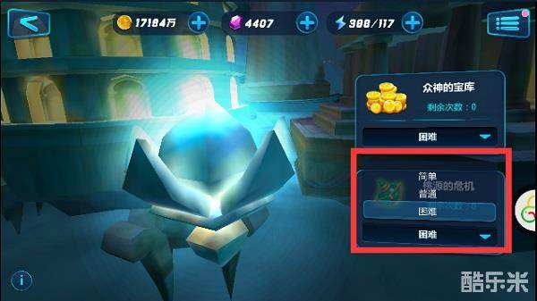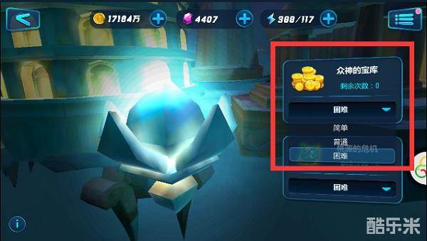 众神的宝库(看上去就很多金的哦),副本分为三个难度分别是简单丶普通丶困难。根据不同的难度,获取的金币就不同(难度越高金币越多)
