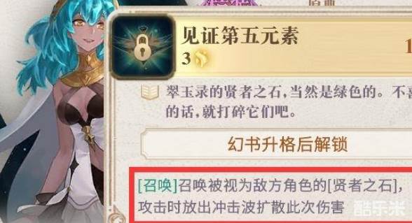 艾梅拉德是一本群攻幻书,但她最大的能力不是自身的输出,而是可以召唤一个被视为敌方单位的“贤者之石”。当我方队友攻击它时,贤者之石会将自身所受伤害变为对敌方全体的范围伤害。搭配群攻幻书,艾梅拉德同样可以打出相当亮眼的伤害。如果你的主力输出只有一个群攻,练她可以让你阵容的群攻伤害提升一个档次。