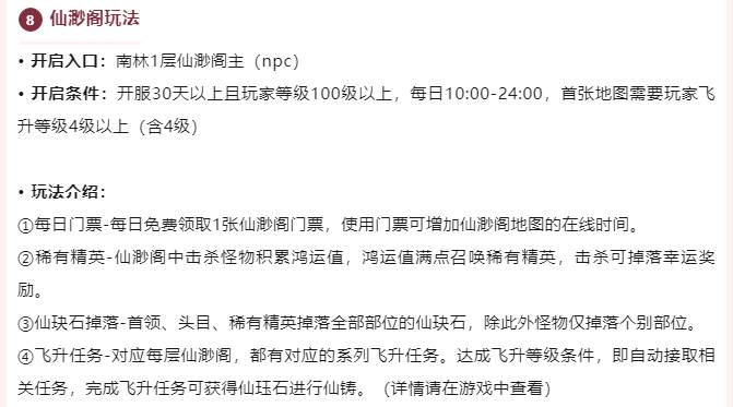 大侠们是否觉得游戏玩法功能不够丰富?小编现在就替大家解决这个问题!新增功能仙之道,只要大侠们开服50天以上(含50天)且飞升等级1级以上(含1级),就可以升级仙之道获得飞升历练加成,江湖币加成等。更有仙渺阁玩法,可每日免费领取1张仙渺阁门票,使用门票可增加仙渺阁地图的在线时间,击杀怪物召唤稀有精英,仙渺阁掉落的仙玦石还可进行仙铸大大提高实力呢!