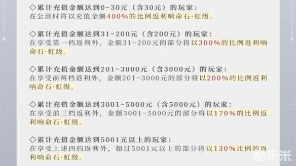 此外,在【调调测试】期间,在游戏内充值的总金额将按照1RMB:10响命石虹级的比例在公测时进行梯度返利。返利的领取方式为公测开启后,使用与【调调测试】期间进行充值的同一账号登陆游戏,领取邮件。注意是同一账号下仅有一个角色领取。返利邮件的领取有效期为90天。