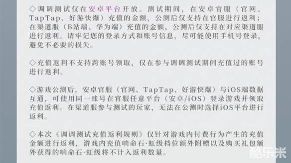 不过也需要注意,【调调测试】仅限于安卓平台开放,期间在安卓官服(官网、TapTap、好游快爆)充值的金额,公测后仅支持在官服进行返利。届时,安卓官服将与iOS端数据互通,可使用同一账号在官服任意平台登陆游戏并领取福利。
