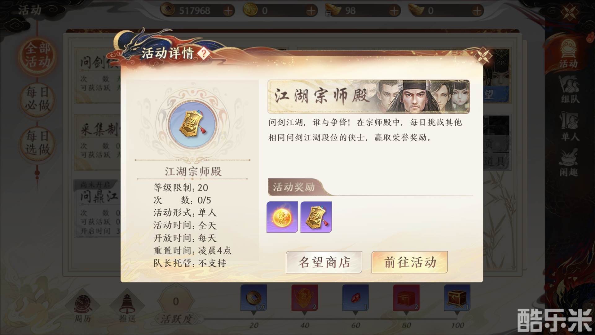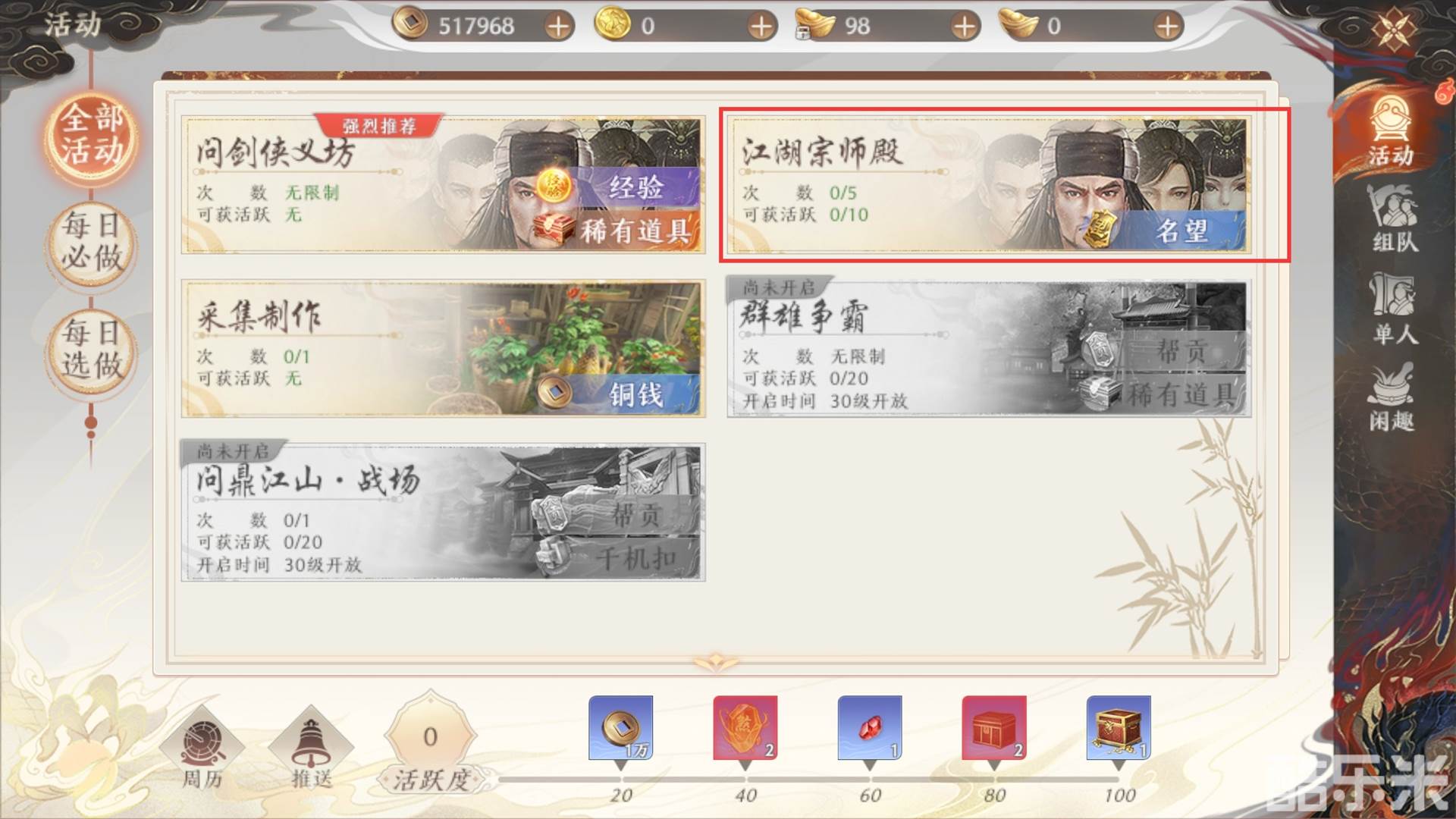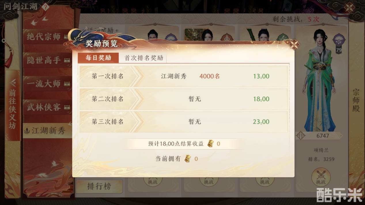 少侠可在「江湖宗师殿」中,挑战同处一个江湖榜的其他侠士(无需侠士在线)。