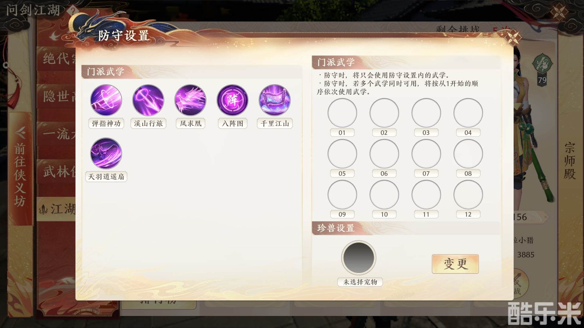 少侠可以预先进行【防守设置】,保护自己的排名,也可以挑战其他排名的侠客。
