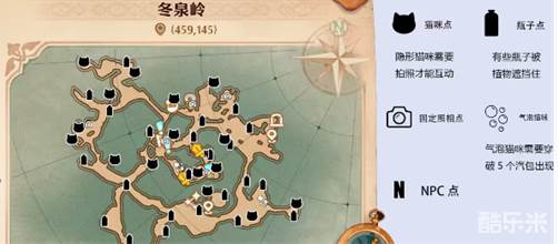 1、猫咪图案代表猫咪点,部分隐身猫咪需要玩家拍照互动。