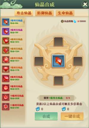 2:每一级仙晶都可以通过4个低等级仙晶合成下一等级仙晶,当合成11级仙晶时候,每四个10级仙晶合成的成功率仅为20%初始概率,每次合成失败均会增加10%概率,一旦合成成功,概率将会恢复初始概率;