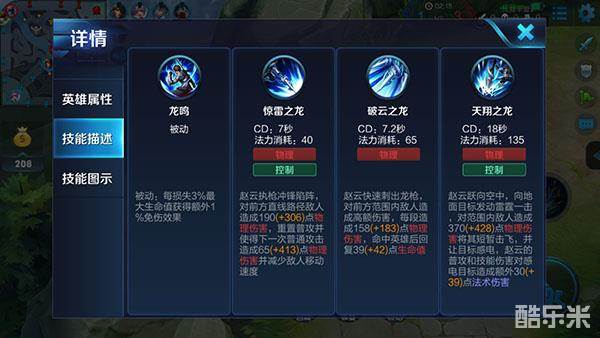 分析:赵云的被动技能没有增强他的输出能力,但是对他的生存能力却有着极大的加强,被动技能的效果是赵云的生命值越低,获得的免伤效果就越多,这个被动技能让赵云在团战的时候很难被敌人秒杀,在前期和敌人对战的时候,凭借着低生命值时的高额免伤,能够轻易反杀敌人。