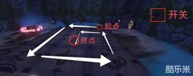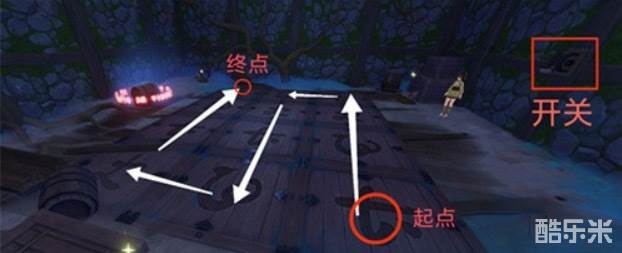 3.启动机关:解密成功地板出现一个洞,跳下去以后出现一个锁住的宝箱以及新的解密。解密路线如图所示