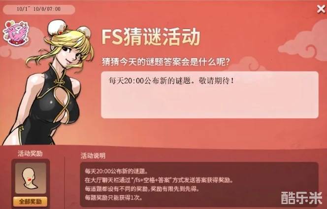 10月1日开始每天晚上20:00将公布新的谜题,在大厅聊天栏通过“/fs+空格+答案”方式发送答案获得奖励,每道题设有不同的奖励,奖励有限先到先得,每题奖励只能获得1次。