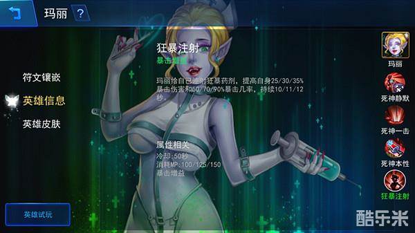 狂暴注射:玛丽给自己注射狂暴药剂,提升自身暴击伤害和暴击几率。