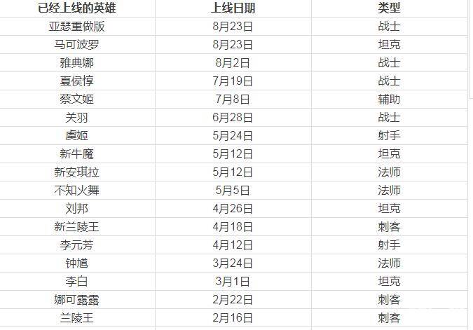 王者荣耀新英雄上线时间表