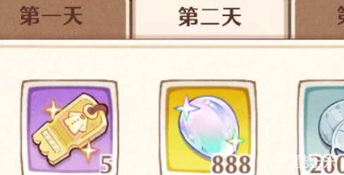 第二天则是可以获得更多的奖励,首先是5张时装的扭蛋卷,这个扭蛋卷可以抽取人物的时装。第二奖励是888个光珀,光珀的用处很多,可以购买各类的材料,最后还有20万的银叶,这个是游戏内的基础货币。