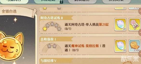 第一个“于猫同行”任务是可以让玩家们获得金色猫灵的奖励,达到全部的人任务之后就能随意选择获得一个金色品质的猫灵了。卡牌是可以给玩家们提供一个红色品质的卡牌,武装是金色品质高等级的未鉴定装备,幻果是高品质的幻果。