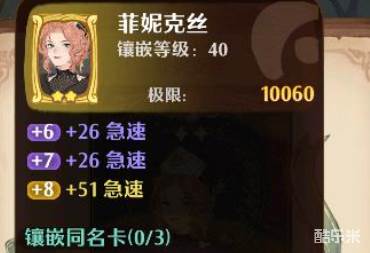 这个卡牌可以帮助我们快速提升攻击属性,当强化到三级以上的时候,我们自身的速度也可以不断叠加,最高可以增加51的速度值,卡牌也是有一定的镶嵌等级,最低40级才可以镶嵌,镶嵌同名卡最高可以达到三张,两张同名卡可以增加490的攻击属性加成,如果拥有三张同名卡,那么我们还可以增加82点急速,全套强化八级以上玩家们还可以额外增加106的急速效果,可以快速提升整个队伍的攻击速度,让玩家们可以先手输出,也能赢得更多的机会。