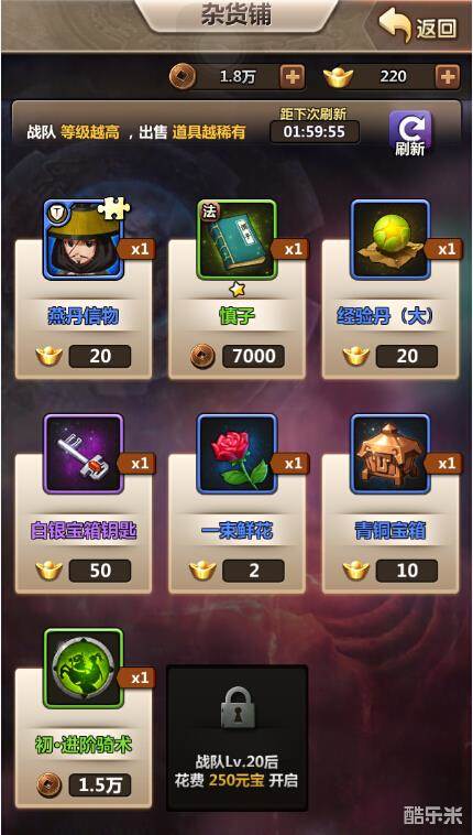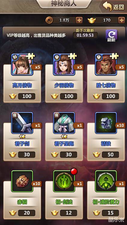 5、 神秘商人,前期高级装备主要产出点之一,战队等级达到20级之后,神秘商人每次刷新都会有几率出现蓝色、紫色装备,对前期战斗力提升至关重要。