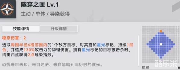 最后是被动远距观测,在攻击距自身半径5格以外敌方目标时,造成伤害提升,并且获得一点导染指数,升级之后伤害加成再次提升,最多能增加两点指数。这也具有意味着该角色非常适合用来攻击远处目标,通过这一特点快速将指数积累起来,频繁发动星群追应,才是正确输出循循环。