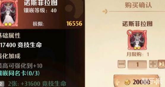 从品质上来看的话,诺斯菲拉图是游戏内的最高品质卡牌了,红色品阶也决定着它在游戏里的地位,它的镶嵌等级为40级,极限战力为一万六以上,也就是说玩家们在获取这个卡牌之后,最多可以叠加一万六的战力加成。使用这个卡牌,它的基础属性可以为我们增加17400的竞技生命值,也就是说玩家们在战斗的时候,生命属性将得到大幅度提升,我们在团队作战的时候,这个基础属性加成是非常重要的,可以更好的保住护我们的生命。