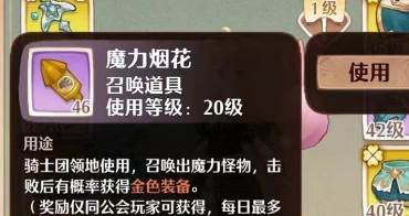 3、魔力烟花。这个道具是通过大猫货运获得的道具,在神秘情况下可以使用这个道具。这个只能在骑士团领地内进行使用,效果就是释放一枚烟花弹,但是会召唤出一个蘑菇皮皮。可以选择击败也可以选择留给骑士团内的成员们去攻击,有武器道具奖励。
