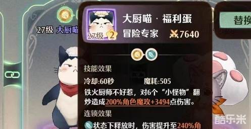 大厨喵的定位是冒险专家,在技能上也是属于群攻技能。初始技能是在能在范围内的6个目标进行翻炒的效果,造成200%角色的伤害值。在1星状态下给予玩家攻击+20,达成2星连锁技能之后,可以提升角色240%的攻击伤害值和魔法防御30的加成。