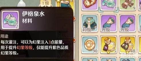 在游戏中有为幻果也是需要成长的,其中生长素可以用来提升幻果的等级,同时伊格泉水材料用来浇灌幻果,每次使用可以提升3点能量,伊格泉水仅对紫色品质及以上的幻果启作用。