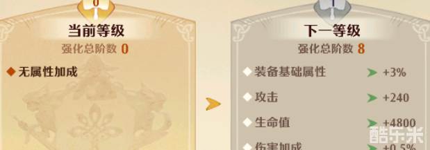 强化大师的提升方法就只能通过玩家们提升装备的星级、品阶来获取了,举个例子来说,第一个阶段从零级提升到一级就需要玩家们将所有装备提升到一阶以上,并且最少有八个一阶以上的装备才能提升一个等级,越往后面提升的品阶就会越高,一个品阶需要强化最好四次,也就是四星以上才能升一阶,对于新手来说还是有一定困难的。