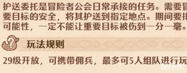 护送任务需要3人以上才可以接取,如果玩家的人数不够的话,可以请佣兵代替玩家进行任务,任务的总体难度较为适中,玩家们只需要注意好护送对象的位置,以及及时保护好它即可。