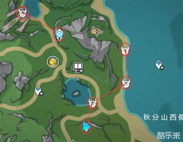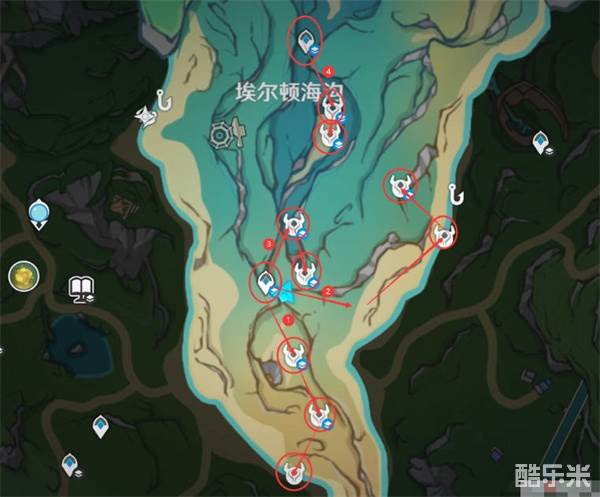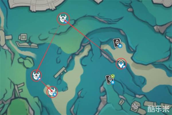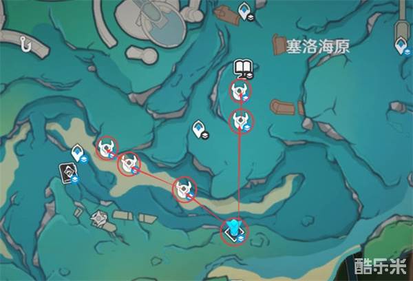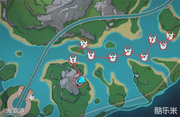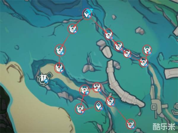1:第一个路线位置在枫丹廷上面,一共有十四个原海异种,具体的路线如图所示;
