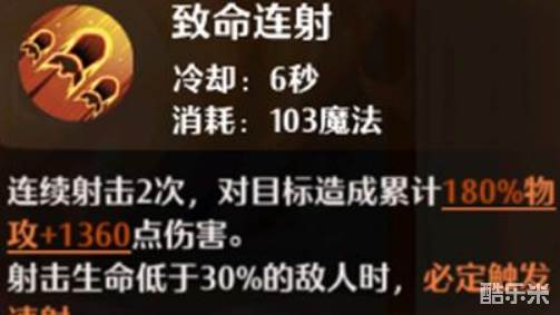 铳士的单体技能【致命连射】非常强力。使用这个技能时,铳士会对目标进行2次射击,共计造成180%的物理伤害,并额外增加1360点伤害。当目标的生命值低于30%时,必定会触发【速射】效果。使用这个技能需要消耗103点魔法值,并且冷却时间为4秒。