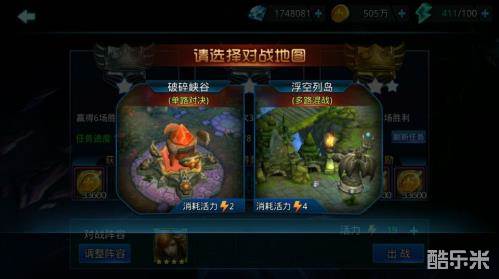 人机对战共分为两种对战地图,1种是单路对决的破碎峡谷,1种是3路混战的浮空列岛。