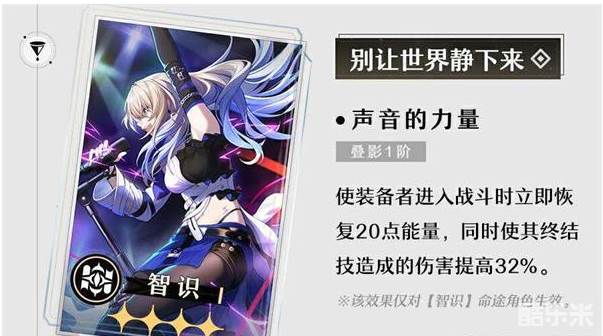 3.特效2在叠影5时提供64%终结技伤害加成,数值不低,但目前基本没有完全依赖终结技输出的智识角色,因此也就更没有抽取光锥别让世界静下来的必要。
