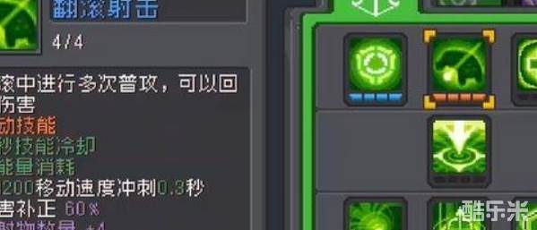 翻滚射击这个技能也可以它全部点满,它主要的效果是可以让大家在游戏中进行翻滚的时候,也依然可以对敌人进行多次普攻,并且在整个过程中还可以回避敌人的伤害,每次释放该技能会释放掉四能量,然后以1200的移速进行冲刺0.3秒,还可以进行60%的补伤,投射物的数量会额外增加4。