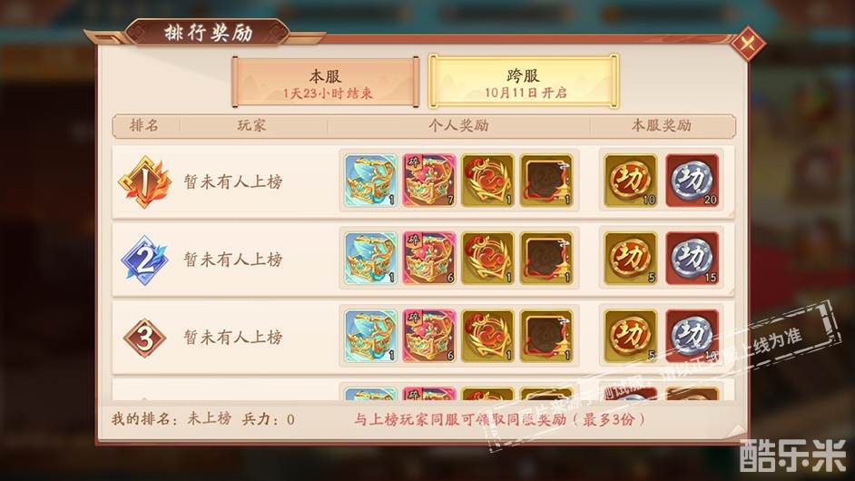 活动期间,通过充值、活跃、登录获得的军旗、军鼓、军号可招兵买马获得大量兵力,再根据兵力进行排名。排名分为本服排名以及跨服排名。