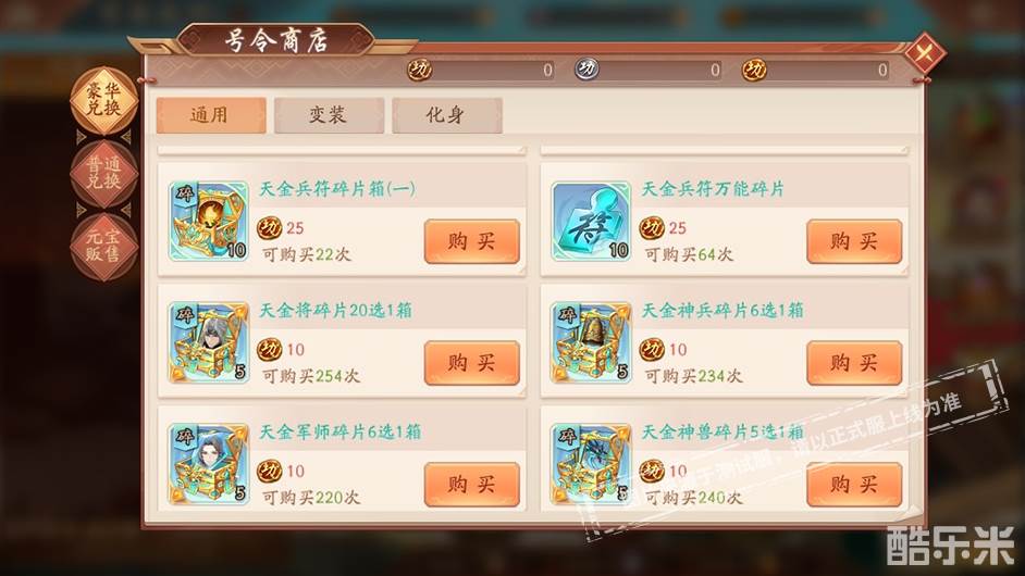在通用商店中,可兑换天金兵符碎片箱(三)、天金兵符碎片箱(二)、天金兵符碎片箱(一)、天金兵符万能碎片、天金将碎片20选1箱、天金神兵碎片6选1箱、天金军师碎片6选1箱、天金神兽碎片5选1箱、天金装备碎片箱、赤金紫金资源、天幻羽毛碎片、赤炼羽毛碎片、幻冥羽毛碎片、苍穹幻赤石、星宿凝晶等珍稀奖励;