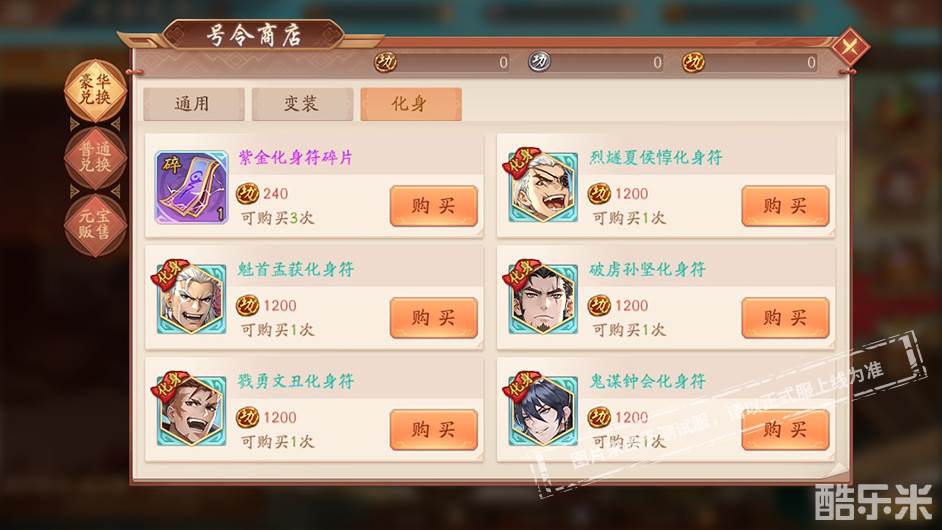 在化身商店中,还可兑换紫金化身符碎片、一至四代天金将化身符、赤金化身符,一定不要错过。