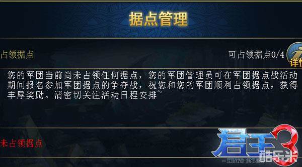 据点战在每周的周一、周三、周五晚上0:00-21:45时都开启,所以玩家可以在这3个时间段里尽情体验刺激的据点战,这比要塞争夺稍微激烈。在时间方面,《君王3》后面还会做出更合理的调整哦!