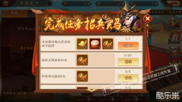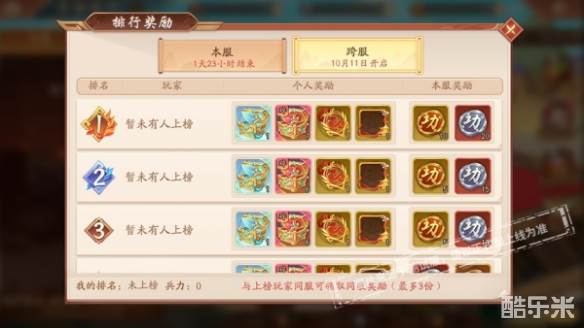 活动期间,通过充值、活跃、登录获得的军旗、军鼓、军号可招兵买马获得大量兵力,再根据兵力进行排名。排名分为本服排名以及跨服排名。