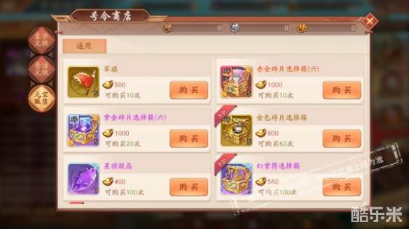 在通用商店中,可兑换天金兵符碎片箱(三)、天金兵符碎片箱(二)、天金兵符碎片箱(一)、天金兵符万能碎片、天金将碎片20选1箱、天金神兵碎片6选1箱、天金军师碎片6选1箱、天金神兽碎片5选1箱、天金装备碎片箱、赤金紫金资源、天幻羽毛碎片、赤炼羽毛碎片、幻冥羽毛碎片、苍穹幻赤石、星宿凝晶等珍稀奖励;