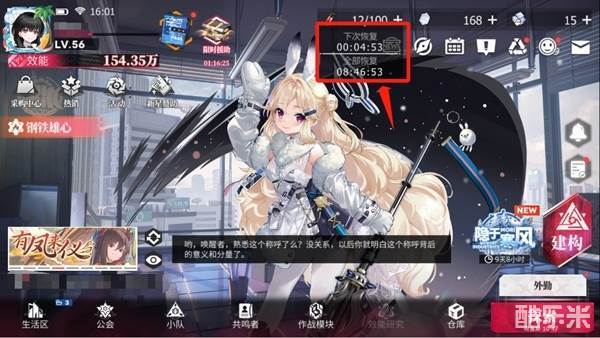 2、在主界面点击行动点,可以查看下一次恢复所需的时间以及恢复到100点所需的时间。尽量不要让行动点闲置。
