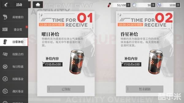 6、在日常补给中,每天在指定时间登录两次,可以获得100点行动点。如果错过了白天的补给,可以消耗50颗异极石来领取。