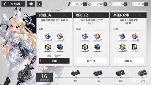 公会的事务大厅每天都会出现任务,每天都要检查并完成任务,以获得公会经验和贡献点等奖励。